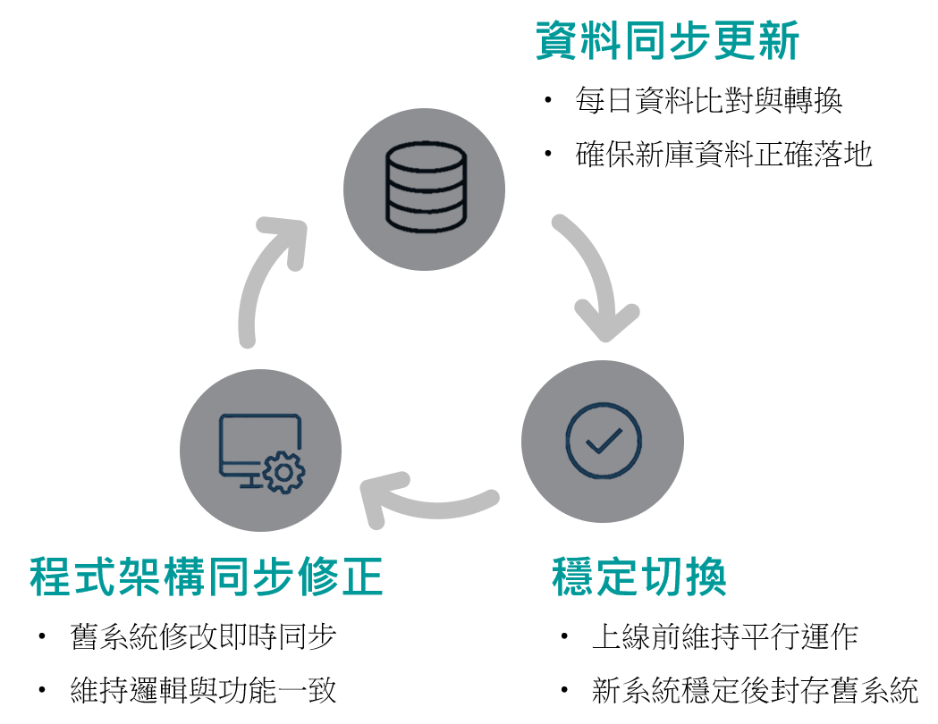 核心在於新舊系統並行運作,透過每日資料同步與程式更新,逐步建立完整的新系統。此方式能在上線前完成充分驗證,確保資料與功能一致,並讓使用者無感切換。最終於新系統穩定後,才正式封存舊系統,達到平滑過渡,降低升級風險,並提升團隊推動數位轉型的信心與效率。